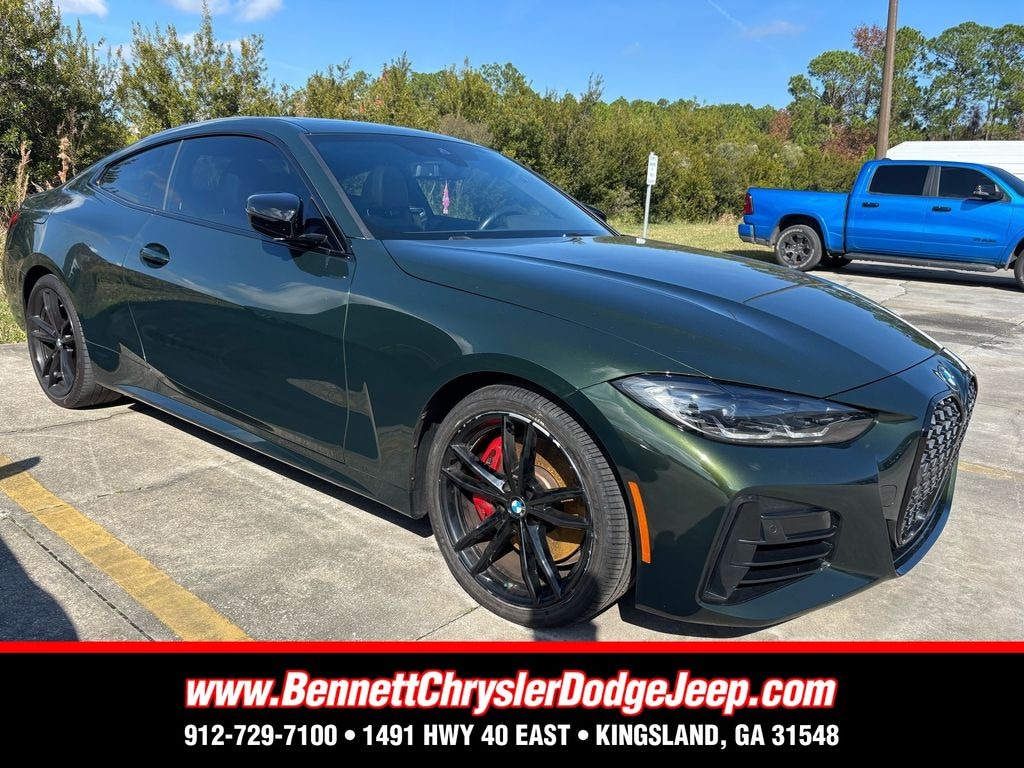 Bennett Chrysler Jeep Dodge Ram is proud to offer this wonderful-looking 2023 BMW 4 Series in Green Metallic This vehicle has passed our comprehensive inspection and comes with the following Connected Package Pro, M Sport Package Pro, Premium Package (Head-Up Display, Heated Front Seats, Heated Steering Wheel, and Live Cockpit Pro w/Navi), Shadowline Package (Black Mirror Caps, Extended Shadowline Trim, M Shadowline Lights, and M Sport Brakes w/Red Calipers), 10 Speakers, 4-Wheel Disc Brakes, ABS brakes, Air Conditioning, Alloy wheels, AM/FM Radio, AM/FM radio: SiriusXM, Apple CarPlay & Android Auto Compatibility, Auto High-beam Headlights, Auto-dimming door mirrors, Auto-dimming Rear-View mirror, Automatic temperature control, BMW Assist eCall, BMW TeleServices, Brake assist, Bumpers: body-color, Compass, ConnectedDrive Services, Delay-off headlights, Driver door bin, Driver Lumbar Support, Driver vanity mirror, Dual front impact airbags, Dual front side impact airbags, Electronic Stability Control, Emergency communication system: BMW Assist eCall, Enhanced USB & Bluetooth w/Smartphone Integration, Exterior Parking Camera Rear, Four wheel independent suspension, Front anti-roll bar, Front Bucket Seats, Front Center Armrest, Front dual zone A/C, Front reading lights, Front Ventilated Seats, Fully automatic headlights, Garage door transmitter, harman/kardon Surround Sound System, Heated door mirrors, Hi-Fi Sound System, Illuminated entry, Increased Top Speed Limiter, Knee airbag, Low tire pressure warning, Lumbar Support, Memory seat, Navigation, Navigation System, Occupant sensing airbag, Open Pore Fine Wood Oak Grain Trim, Outside temperature display, Overhead airbag, Overhead console, Panic alarm, Passenger door bin, Passenger vanity mirror, Perforated SensaTec Upholstery, Power door mirrors, Power driver seat, Power Front Seats, Power moonroof, Power passenger seat, Power steering, Power windows, Radio data system, Rain sensing wipers, Rear air conditioning, Rear anti-roll bar, Rear reading lights, Rear seat center armrest, Rear window defroster, Remote keyless entry, Security system, SiriusXM Satellite Radio, Speed control, Speed-sensing steering, Speed-Sensitive Wipers, Split folding rear seat, Spoiler, Sport Seats, Sport steering wheel, Steering wheel mounted audio controls, Tachometer, Telescoping steering wheel, Tilt steering wheel, Traction control, Trip computer, Turn signal indicator mirrors, Variably intermittent wipers, Wheels: 18" x 7.5 M Double-Spoke Bi-color, Wheels: 19" x 8" Fr & 19" x 8.5" Rr (Style 791M), and Wireless Charging;